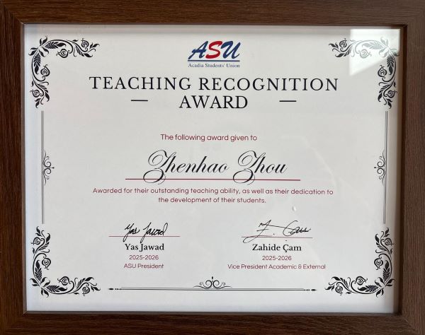Congratulations to Dr. Zhenhao Zhou, who received the 2026 Acadia Students' Union Teaching Recognition Award. Dr. Zhou was nominated by ten students who commented on his passion for teaching, kindness, and knowledge. This is Dr. Zhou's first year teaching at Acadia. To have made such an impact in such a short amount of time is a huge achievement.