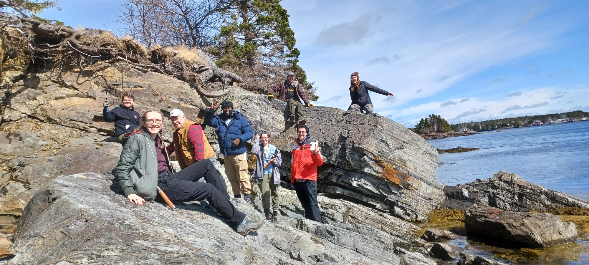 A group of EES students and faculty enjoyed mainly sunny weather for the annual end-of-term geological field trip around the South Shore of Nova Scotia. The two-day trip is the culmination of igneous, metamorphic, and global tectonics courses completed during the academic year. Most stops are on coastal outcrops and included rocks of ages ranging from about 550 million years to 201 million years and from unmetamorphosed (Shelburne dyke) to partially melted during metamorphism (contact aureole of the Barrington Passage tonalite). We pondered the chemistry of the original sedimentary rock that formed the spectacularly large abundant cordierite, staurolite, and andalusite crystals in the Shelburne area, the types of volcanoes that formed the thick mafic and felsic volcanic rocks at Cape Forchu and Cape St. Marys, and what might underlie the Goldenville Group at Bartletts Beach. The trip also provided Dr. Barr with the opportunity to buy dinner for Rowan Kennedy, this year’s “winner” of the annual “prize” for achieving the highest grade on the weekly geography quizzes in the Global Tectonics course. Well done, Rowan.